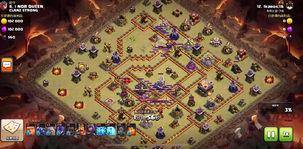 法术与英雄配合能大幅提升引导的精准度与稳定性,狂暴、治疗法术可保障引导部队与主力的生存与推进速度,隐身法术能让英雄或炸弹人安全完成破墙、清边。英雄作为核心攻坚力量,更需精细引导,天女流中用天使配合女王,提前清理侧翼防御与建筑,引导女王沿预定路线推进;蛮王、闰土则负责另一侧清边或吸引核心防御火力,与女王形成双向引导,让中间主力顺利推进。面对分散的阵型或容易分流的部队,可利用骷髅法术、图腾法术召唤单位充当诱饵,吸引防御火力或临时引导部队走向,弥补清边与破墙的细节漏洞。所有引导操作要节奏连贯,清边、引援、破墙、主力投放依次衔接,不给部队偏离路线的机会,让每一步操作都服务于主力集中冲击核心的目标。