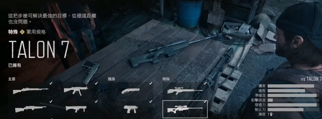 如果想找一把更灵活的狙击枪,Talon7是个不错的选择。它的威力和射程稍逊于BFG.50,但射速更快,弹匣容量也更大,适合中远距离连续射击。这把枪在对付小型尸群或者快速移动的敌人时表现不错,尤其是当你需要频繁调整位置时,它的轻便和稳定性会让你更顺手。