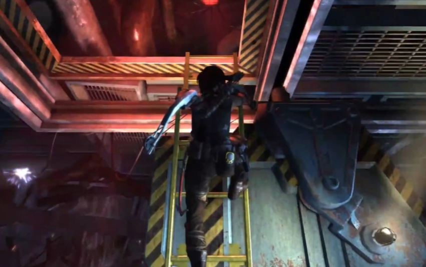 操作吊机时需注意其移动逻辑:绳箭仅能前后牵引,横向移动需攀附梯子手动推动。当天花板导轨被钢管阻挡时,必须优先清除障碍。观察导轨结构可发现其为3×3缺角布局,需将吊机沿特定路径推至目标位置。当吊机挂钩卡住电缆后,需反向拉动绳箭以破坏门锁,需确保劳拉站位安全,避免被反弹的吊机撞击。