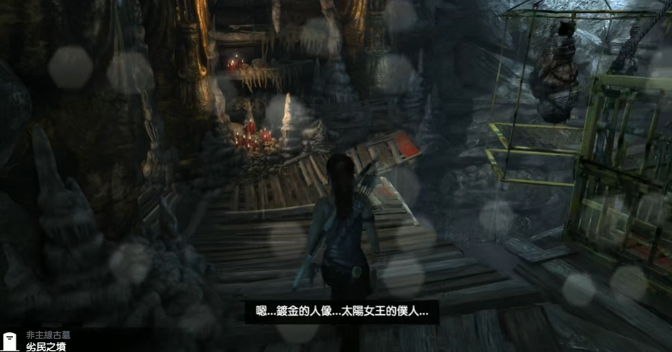 洞穴里摆着凌乱的头骨和镀金雕像,说明这里和邪马台女王的仆人有关。主要机关是两个吊篮和三个可燃的承重物。咱们要先把左侧吊篮的承重物烧掉,这样它就会升上去。具体操作是:跳到对面高台拿火把,回来点燃吊篮上绑着布条的木头,烧完三个后立刻推右侧吊篮,这时候左侧吊篮就会翘起来。