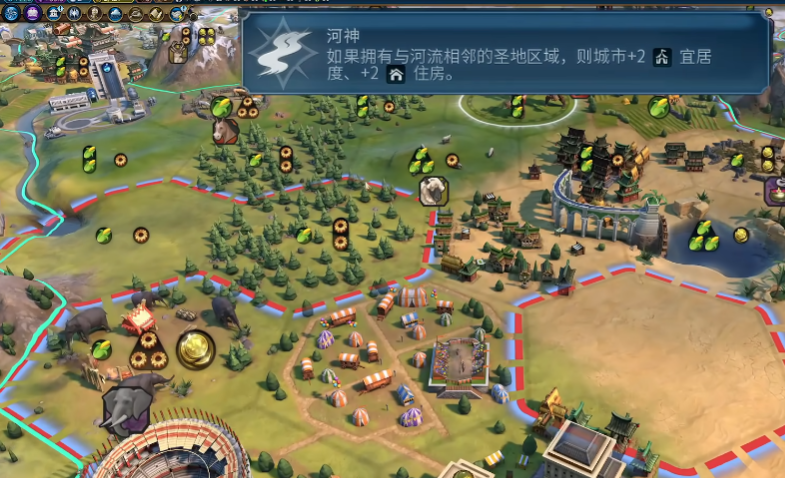 高棉的特色能力和水渠、农场紧密相关,所以万神殿选择也要配合地形。如果开局附近河流多,可以选河神,它能给圣地提供住房和宜居度,缓解高棉人口暴涨带来的住房压力。河神的效果虽然前期不明显,但中后期收益很高,尤其适合走宗教胜利或文化胜利的玩法。如果周围有大量沼泽或绿洲,烂地夫人也是不错的选择,它能给这些地块加生产力,前期多几锤能加快区域和奇观的建造速度。